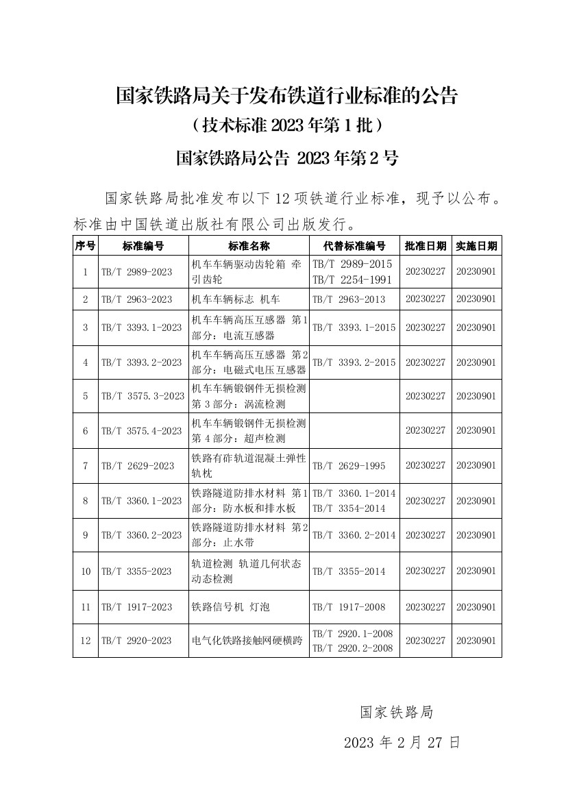 國家鐵路局關于發(fā)布鐵道行業(yè)標準的公告(技術標準2023年第1批)